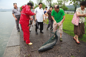 昨天早上6点多,有读者打来电话举报,西湖边有人偷钓,钓上来一条近一米长的大青鱼。