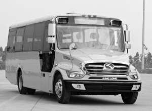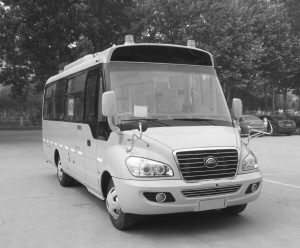 第三款车型由郑州宇通生产,尺寸为长8.045、宽2.5米、高3.06米,外形也是仿校车改造升级,上下客门采用三级踏步。