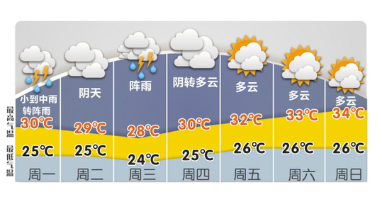 但从周四开始,随着副热带高压势力逐渐加强,天气慢慢转晴,气温就又要升上去了。虽然目前来看,超过35℃的高温日子暂时还不会出现,但到了周末,最高气温升到33-34℃,还是有点热的。