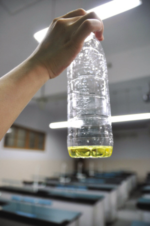 记者也带了一瓶油,请杭州市高级中学的生物实验员郑文杰老师称重。25克油灌入矿泉水瓶,离底部也就1厘米的量。