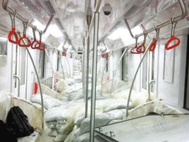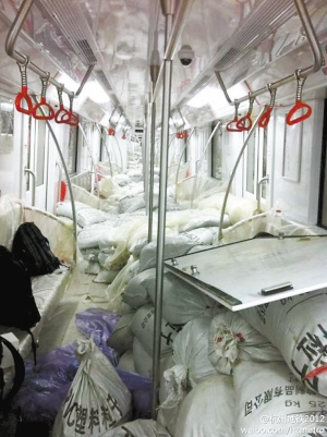 整节地铁车厢里堆放满了麻袋,地板上座位上都是,这是在做什么呢?