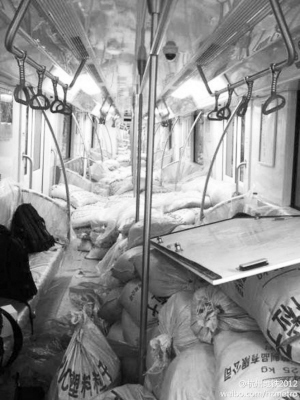从照片上看,确实很像记者曾经试乘过的1号线车厢。照片上车厢里垫了一层塑料保护薄膜,薄膜上堆满了沙包等重物。