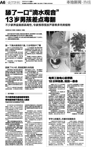 “这种植物在土壤含水量大时,便会从叶子上滴水,而且因为它开的花像观音,所以被叫做滴水观音。滴水观音的根、茎中的白色汁液有毒,滴下的‘水’也有毒,如果皮肤接触,会导致瘙痒或强烈刺激,眼睛如接触可引起严重的结膜炎,甚至失明。”