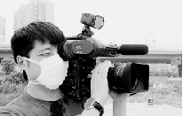 摄像记者戴口罩采访。