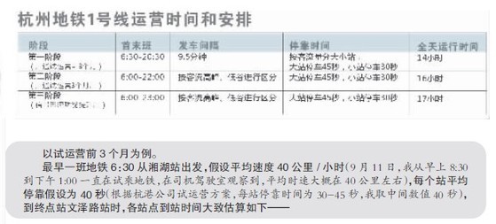 最早一班地铁6:30从湘湖站出发,假设平均速度40公里/小时(9月11日,我从早上8:30到下午1:00一直在试乘地铁,在司机驾驶室观察到,平均时速大概在40公里左右),每个站平均停靠假设为40秒(根据杭港公司试运营方案,每站停靠时间为30-45秒,我取中间数值40秒),到终点站文泽路站时,各站点到站时间大致估算如下——