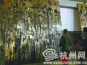 制作这面浮雕墙,许江首先根据自己的手稿,用玻璃钢制作了一片300多株葵花组成的葵地,拍摄下反转片后经过处理成为铜版创作的素材。