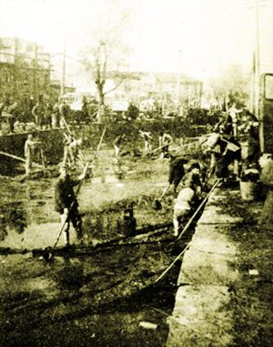 先由市政工程处将涌金闸门的水源“闸断”,堵住通往西湖的河口,然后,用抽水机将河道里的水抽干。多年的积淀,浣纱河河道淤积了很深的淤泥,清除河底淤泥的工程量非常大。于是,政府下达了一项“政治任务”:号召全市机关、学校、企业的干部、员工、师生,轮流到浣纱河来挑泥。