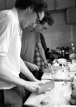 接下来,洋学生们每人分到了一块肉,一段京葱,调味料是共用的。他们低头谋划了一下,分成了两个小组,两个女生许丽娜、辛妮先开始切肉丝和葱丝,男生石江和一文炒酱。看着老外第一次拿起中国菜刀的样子,真叫人为他们的手指头担心。不过,洋学生们显然很快就爱上了宽阔的中国菜刀:能切能片、能劈能砍,切完了肉丝还能当临时砧板把肉丝“刮”到盘子里,再“刮”到锅子里!