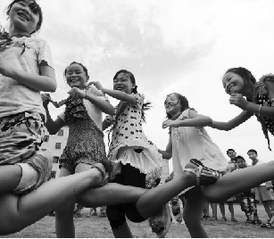 外来务工人员子女越来越多地融入到城市中来。上图为杭州天成教育集团新塘校区的外来务工子弟。(胡元勇摄)下图为浙江上虞盖北镇中心小学学生在体育课上玩“编花篮”游戏。今年该校新学年学生达到2000人左右,外来民工子弟占了70%。(新华社发)
