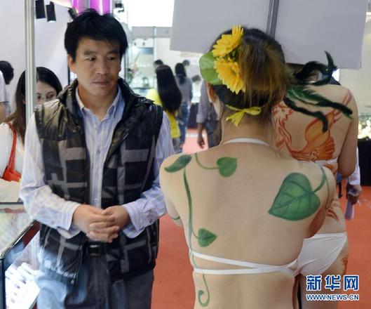 10月25日,两名人体彩绘模特在2012杭州国际顶级名品珠宝首饰展览会现场走秀,吸引旁人关注。