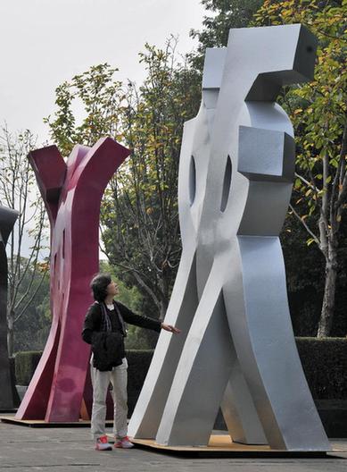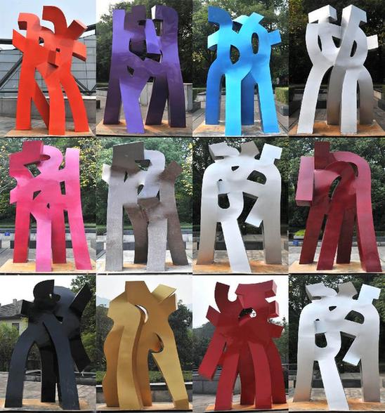这些巨型书法雕塑共有11个,每个高约5米,引得人们纷纷驻足观赏。