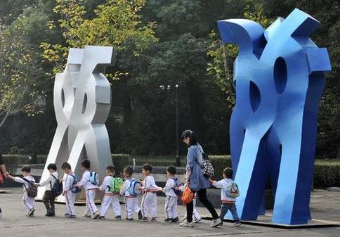 10月25日,小朋友们从杭州西子湖畔的巨型书法雕塑旁走过。