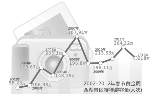 注:2008年春节前,国内部分地区遭遇大雪灾害,受低温冰冻天气影响,西湖风景区在春节长假七天(2月6日至2月12日)共接待中外游客近200万人次,和2007年同期相比明显减少。 制图 李本献