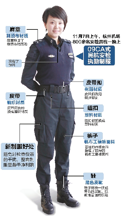“老制服已经穿了20年,这是1992年来,杭州机场安检人员第一次换制服。”机场旅客检查科经理王少真说,新款安检制服设计灵感来自香港方面,与老制服相比,新制服换掉了不少金属配件,这样对旅客过安检就不会有干扰。