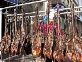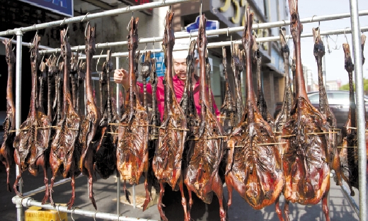 昨天,记者来到东新路美食街,一家店门口,五六根晾衣杆上,齐刷刷挂着酱鸭、酱肉还有香肠,每只酱鸭身上都用竹签撑开,四仰八叉的。