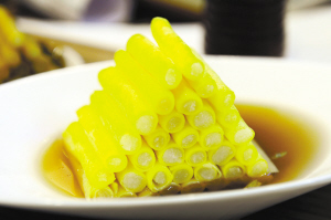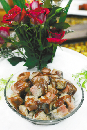 锦绣鱼皮、秀水鱼肚冻、美极划水、黄金万两,这四道冷菜一亮相中国杭州美食节的百道获奖冷菜展台,就博得了叫好声一片。千岛湖鱼味馆老板王金生站在展台边介绍:“以前我们也是将这些鱼下水扔掉,但是这几年,我们也意识到,既然餐厅是一家以鱼为特色的餐馆,那么冷菜方面一定有看家菜,所以我们把千岛湖有机鱼的鱼下水都利用起来了。鱼鳞裹上了蛋黄下锅炸,黄灿灿一盘,叫黄金万两;鱼肚无需任何凝固剂,水中煮熟调味冷冻,就是最好的美容佳品,女士点的特别多;而鱼划水则仿照杭州酱鸭的做法,酱一酱、晒一晒,非常入味,不少老客都多点一盘美极划水,打包带走。”