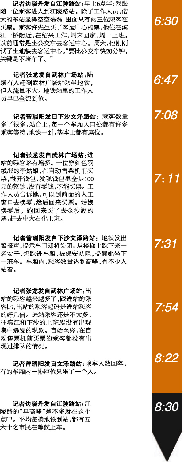 我们一共有5路记者,一路到地铁控制中心全程跟踪地铁早高峰,一路在交警指挥中心看地面车流是否有变化,还有三路分赴市中心的武林广场站、下沙的文泽路站、滨江的江陵路站,现场采访那些“弃车”改钻地铁的乘客。