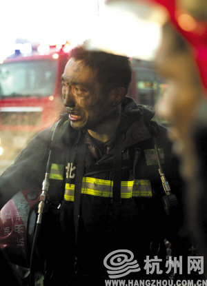 知道队友遇难的消息后,萧山消防市北中队代理中队长赵富周掉下了眼泪。 王亮 摄