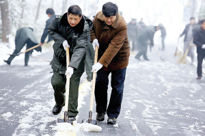 之所以昨天开始扫,还是有讲究的。“天气预报说,昨天雪才停,我们索性等到雪小了才扫。”余锋谈经验,下雪时扫雪,这边扫完,没多久又积起来了。还不如等雪停了再动手。扫雪费时费力。“先扫雪,再用铲子把冰破除,再用扫把把冰清除。”