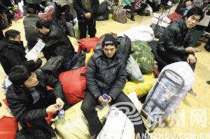昨天下午,杭州城站火车站,他们围坐在一起,守着30多件行李,正在聊天。