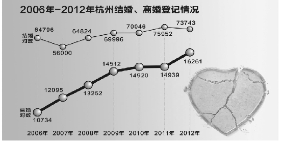 昨天,杭州市民政局发布了2006年到2012年杭州登记离婚数据。数据显示,从2006年杭州市婚姻登记管理系统完全建立至今,杭州的离婚对数已经连续7年递增。而像罗毅夫妇这样的80后小夫妻,成了杭城离婚的主力军。