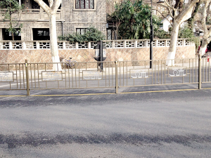 经常逛西湖的市民,一定会发现,在断桥口、距离北山路大约100米处,放置着一排与众不同的交通隔离设置,它是铁质的,呈灰黑色,显得很古朴,上面印有杭州的市标。它们和相比其他路段放置的白色栅栏相比,更具有杭州本土特色,与西湖断桥古色古香的气韵相得益彰,在确保了交通使用功能的基础上,还具有一定的观赏性。安放在游客如织的断桥景区,无疑给景区增色不少。