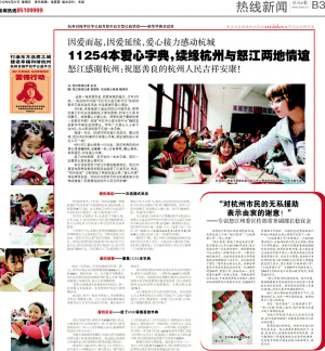 大家一定还记得,去年5月底,本报掀起了一场杭州和昆明两地共同携手的大型公益活动——新华字典总动员,为云南怒江州福贡县的小学生们筹集了11254本《新华字典》。