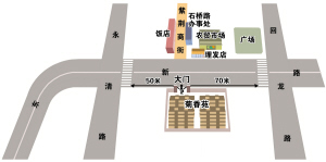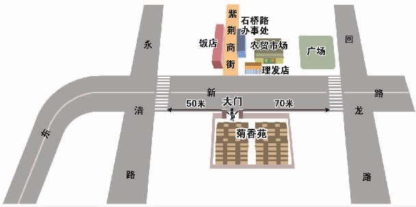 1月24日上午,记者来到菊香苑大门口,大门正对着东新路,往东约70米,是东新路回龙路口,那里有红绿灯人行横道线,往西约50米,是东新路永清路口,同样有红绿灯人行横道线。