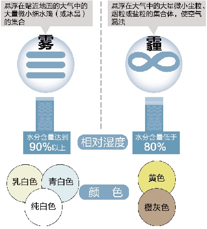 央视气象主播宋英杰在微博上很形象地介绍了两者的区别:“雾(的预警符号)是站着的三,霾(的预警符号)是躺着的8。霾本身就是污染物的积聚,雾未必就是污染,但却是污染良载体,即窝藏犯。湿时多是雾,干时多是霾,但往往雾霾交替或雾霾混杂,于是成为同案。消除雾霾,靠风‘干洗’,靠雨‘水洗’。但是,人努力,比天帮忙更可靠!”
