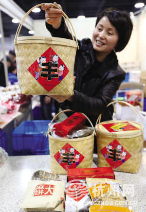 礼盒选用毛竹片制作,做成农村里“小粮仓”模样,盒子面上贴了大红“丰”字,很喜庆。