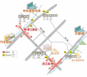 如果你要到汽车南站、近江大厦、华东家具市场、近江电影大世界等场所,要坐公交车到近江村站,或坐地铁在婺江路站下车;