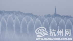西湖边,音乐喷泉中的保俶塔。记者 胡聪 摄