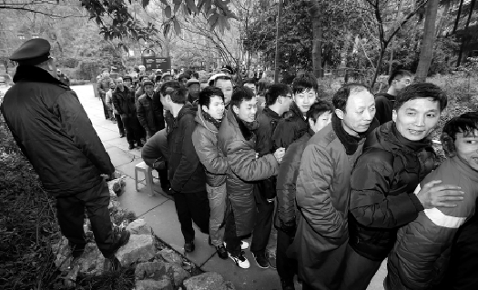 昨天早上七点,小胡一家三口赶到灵隐寺飞来峰售票处购买除夕夜祈福活动——俗称“烧头香”的门票。谁知,走到飞来峰的灵鹫神行牌坊前,她就不得不停下脚步。迎接她的,是一个弯弯曲曲的长队,人头攒动,一直延伸数百米开外。
