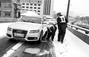 昨天17:08,金衙庄,清江路上桥口,一辆上桥的车子打滑,交警连忙在车轮底下垫上草垫。 记者 朱丹阳 摄