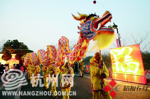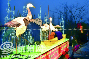 在湿地北门口,迎面而来的是金蛇送福彩灯,传统佳节的生肖“蛇”造型及西溪主题牌楼,再加上熙熙攘攘的人流,形成一幅热闹的元宵佳节景象。在蒋村集市,则是“火柿映波”的灯区,这里突出显示的是西溪火柿节为主题的造型,河渚街口,则是一组“曲水寻梅 秋芦飞雪”为主题的彩灯,以西溪探梅节及听芦节为主题的造型让夜色中的西溪湿地平添了一份悠闲之意。在植物园口的西溪问茶广场处,还有一组“美丽花朝 龙舟胜会”的彩灯,以西溪花朝节及龙舟节为主题的造型,在美丽的彩灯映衬下,透露出了浓浓的喜庆祥和的节日气息。在观赏华美彩灯的同时,游客们可以更完整地了解湿地的历史文化背景,趣味盎然。