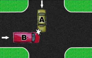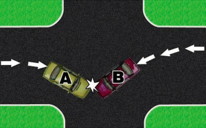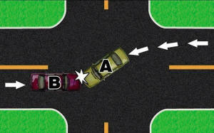 A车直行,应让A车右侧的B车先直行,若出事故,A车负主要以上责任。