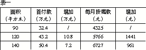以同一个楼盘三套面积分别为90、120、140平方米的房源为例,不考虑楼层、地段等因素,假设售价均为12000元/平方米,购房者为首次置业,首付3成,等额本息方式贷款30年,贷款利率为2012年7月6日后利率下限(85折)。购房成本分别如下。(见表一)