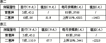 假设二套房政策更为严厉,首付7成,利率上浮20%,那么购房者购买二套房时,所要支付的首付款会更多。(见表三)