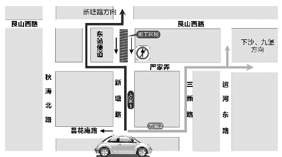 途经新塘路车辆,南向北前往新塘路火车东站方向的,可选择严家弄、原汽车东站便道、艮山西路地面道路进行绕行;