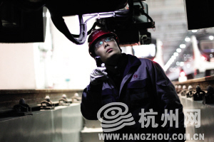 末班车排队,依此回到车辆段,检修工作开始。小李、小周一个绕着列车,一个钻到车身下,用手电筒细细检查我们乘坐的这辆地铁,两个小伙子都长得很帅,不知道是不是特意挑选出来“出镜”的。