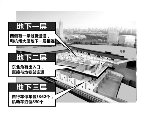 其中地下一层西侧有一条过街通道,和杭州大厦地下一层相连;同时对接现行武林广场东西跑道下的2条地下过街通道,和国大、杭州百货大楼、银泰连接。
