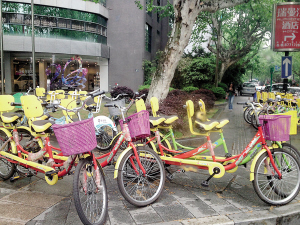 私人自行车租赁在南山路口附近特别集中,其他的在长生路、东坡路、学士路利星购物广场附近和西湖大道附近也有零星分布。这些租赁点都是露天摆放车辆,每个摊位都有几十辆,由于没有地方,只能占用人行道。