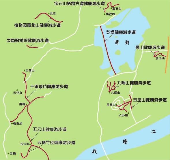 “10条游步道与山有关,海拔高,植被覆盖好,负氧离子含量高。”景区旅游商贸局局长舒国梅说,比如玉皇山、九曜山、五云山、宝石山等等。其中只有一条游步道是在平地的,那就是苏堤。“苏堤里车辆没法进入,环境也很好,合适步行。”