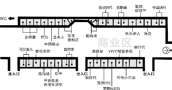 商业街南面以餐饮为主,有“老娘舅”中式快餐,可莎蜜儿蛋糕房、都可茶饮等;北面则有很多服饰店,其中不乏大家耳熟能详的品牌,像秋水伊人、百斯盾等。