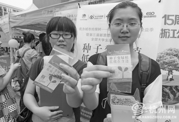 “我拿到了波斯菊、凤仙花、蓝亚麻还有风铃花……”前天中午,杭州电子科技大学管理学院大二的学生小陈和小章在学校活动中心门口免费拿到了四种绿植种子。