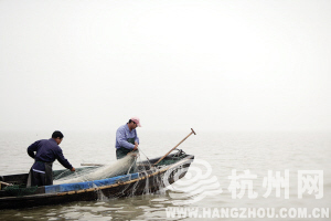 早上7点,钱塘江九堡大桥东水面,童天昌和他的浙杭渔01049已经开始作业,10多张3米高、60米长的银白色渔网一个接着一个撒下去,潮起撒网潮落收网,等待与希望,几十年来日日如此。