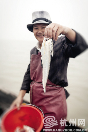 金小明,江干杨家村渔民,从业20多年,是渔民中的少壮派代表。他说,清明节前后,二两重的钱塘江刀鱼能卖到400元-500元一斤,这个月,降到50元一斤。刀鱼价格越贵,来捕的人就多,拉的网越来越长,总量就这么多,人越多捕到的就越少。