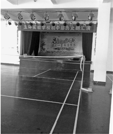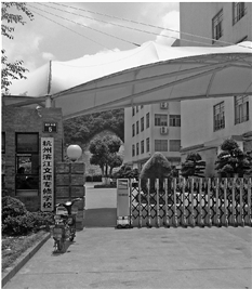 玉环实验学校在杭州的办学地点位于滨江浦沿街道的一条支小路上。学校正门口挂着的是“滨江文理专修学校”的牌子,所以如果没有熟人带领,估计根本就找不到。只有走到学校里面,看到学生胸前的校徽,你才能确认,没有走错,这里就是“玉环实验学校”。