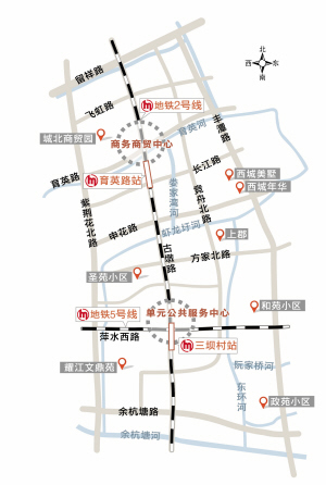 地铁:地铁2号线沿着古墩路走,在育英路口设育英路站,在萍水西路口设三坝村站。三坝村站是个换乘站,在这可换乘5号线——地铁5号线沿着萍水西路走。
