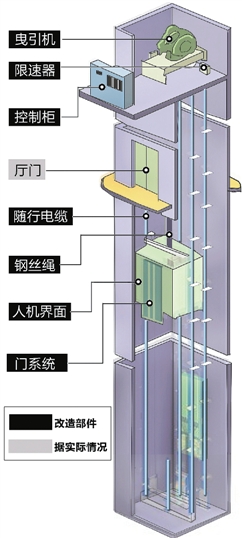 “在国外不少电梯使用30多年依然运行通畅,并不是质量有多好,而是它在不断改造升级。”技术人员介绍,改造升级一来节约时间,比如15个工作日就能完成丰家兜的一部电梯的升级,全新更换至少需2个月;二来,重新拆除,更换新电梯,对建筑本身也会产生一定破坏。另外升级改造比全部更新更环保和节约成本。升级改造后基本能保留原电梯50%左右的部件,费用只有全部更新电梯的一半。
